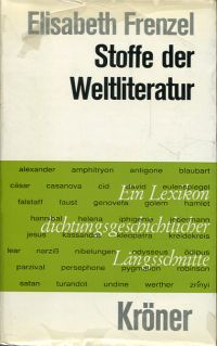 Frenzel, Elisabeth: Stoffe der Weltliteratur. Ein Lexikon dichtungsgeschichtlicher Längsschnitte. 4., überarbeitete Auflage. Stuttgart: Kröner 1976. 8°. XVI, 785 S., Leinen (Schutzumschlag mit teilweise losgelöstem Cellophan und leichten Randläsuren; sonst gut erhalten) (=Kröners Taschenausgabe ; Bd. 300)