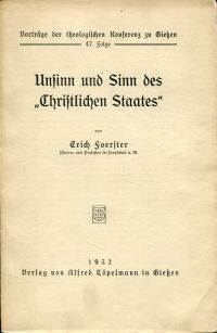 Foerster, Erich: Unsinn und Sinn des „Christlichen Staates“. Gießen: Töpelmann 1932. 8°. 48 S., broschiert (Seiten teilweise nicht beschnitten; Umschlag leicht angestaubt; sonst altersgemäss gut erhalten) (=Vorträge der theologischen Konferenz zu Gießen, 47)