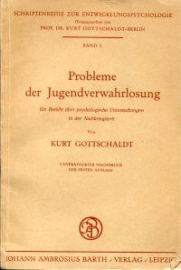 Gottschaldt, K.: Probleme der Jugendverwahrlosung. Ein Bericht über psychologische Untersuchungen in der Nachkriegszeit. Unveränd. Nachdr. d. 1. Aufl. Leipzig: Barth 1952. Gr.-8°. V, 182 S., 3 Abb., Register, broschiert (Papierbedingt gebräunt; abgegriffen) (=Schriftenreihe zur Entwicklungspsychologie, Bd. 2).