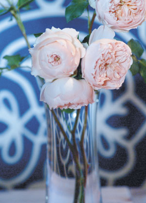 bildreich karten PK 109: pause im atelier. Hochformat. 2004. (Rosen, Vase, Zeltmacher, Wandbehang, Wandmuster, Tapete, Atelier, Küche) Mindestbestellmenge: 15 Karten (auch assortiert).